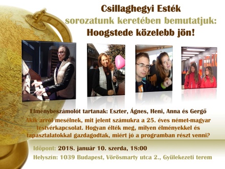 2017. őszén Csillaghegyről utazott küldöttség Németországba, a holland határ közelében található Hoogstede-i testvér-gyülekezetbe. A 25 éves kapcsolat hálaadó alkalma is volt a találkozó.