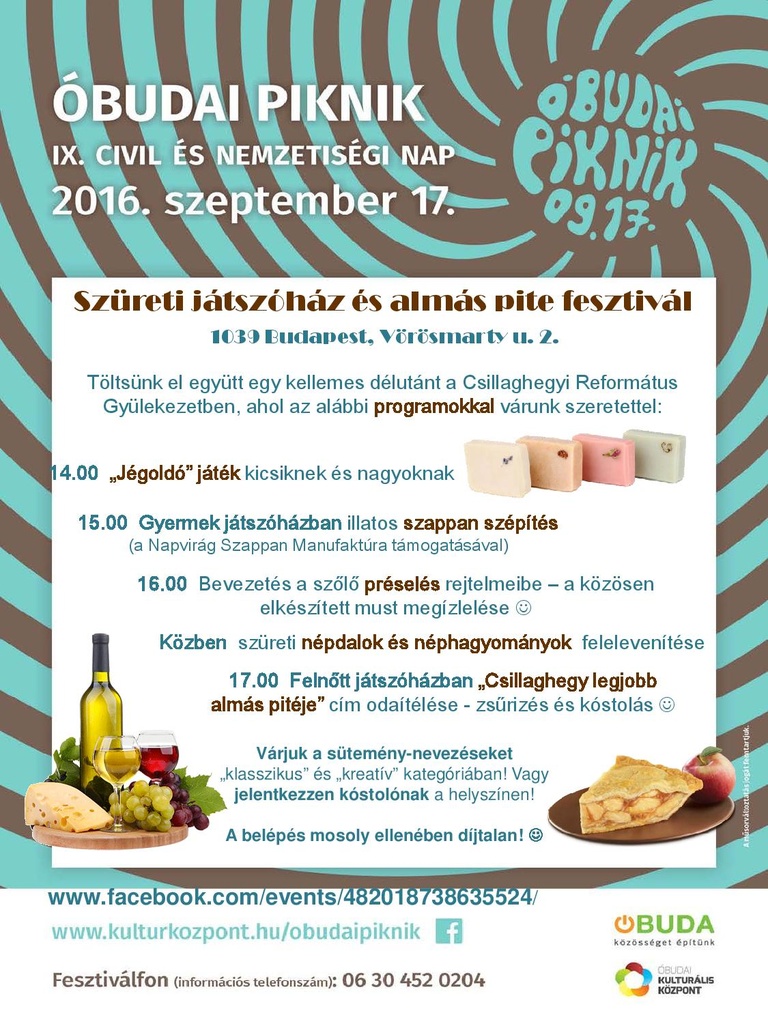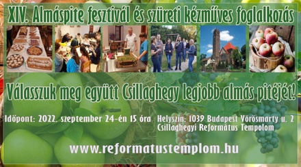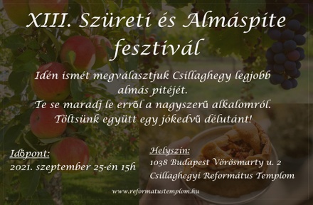 Szeptember 17-én, szombaton kerül sorra az immár hagyományos őszi programunk, a „Szüreti Játszóház és Almás pite fesztivál". Az eredetileg gyermekeknek szánt kreatív délután kinőtte magát, az utóbbi években igazi családi, közösségi programmá vált. Most különösen gazdag programmal készülünk, így kicsit előbb is kezdünk: már 14.00 órától. A program helye a gyülekezeti terem (templomtér alatti szint) 1039 Budapest, Vörösmarty utca 2.