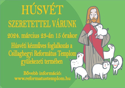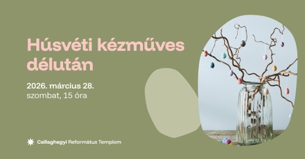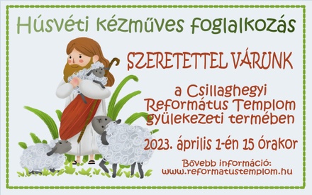 Március 23-án, szombaton 15 órától húsvéti kézműves foglalkozásra várjuk a gyerekeket és a családokat a gyülekezeti terembe (1039 Budapest, Vörösmarty utca 2.). Húsvéthoz kapcsolódó alkotásokkal készül gyülekezetünk kreatív csoportja. Különösen is nagy szeretettel hívom hittanosainkat és a gyermek-istentiszteletekre járó gyerekeket!