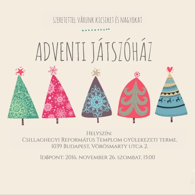 Advent első vasárnapja előtt rendezzük az ünnepi játszóházat a gyülekezeti teremben. Közös éneklés, rövid áhítat után különféle kreatív módszerrel készíthetünk különleges karácsonyi, adventi díszeket. A játszóházon kipróbálható ötféle technikáról a Facebook esemény oldalon szerezhetünk bővebb információkat. Igyekszünk szórólapokat küldeni a hittanosoknak is. Előre is köszönöm a közreműködők készülését és segítségét!