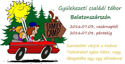 Sok szeretettel hívogatunk a Csillaghegyi Református Gyülekezet családi táborába. A tábor célja, hogy együtt töltsünk néhány napot a gyülekezeti tagokkal, családtagokkal, és miközben élvezzük a helyszín adta kényelmet, strandolási, sportolási, kirándulási lehetőséget, figyeljünk az Úrra.