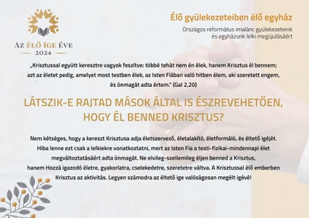 Nem kétséges, hogy a kereszt Krisztusa adja életszervező, életalakító, életformáló, és éltető igéjét. Hiba lenne ezt csak a lelkiekre vonatkoztatni, mert az Isten Fia a testi-fizikai-mindennapi élet megváltoztatásáért adta önmagát. Ne elvileg-szellemileg éljen benned a Krisztus, hanem Hozzá igazodó életre, gyakorlatra, cselekedetre, szeretetre váltva.