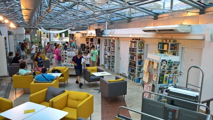 A gyülekező helyre visszaérkező kirándulók folyamatosan átszivárogtak a templom mögötti parkban, szinte a falhoz támasztva kialakított könyvesboltkávézóba. Végre a kávét is be lehetett pótolni, de sokan a házi limonádét is kipróbálták. A forró kávé illata jól illet a légkondicionált térhez.