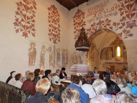 A templomban élvezetes és részletes ismertetést kaptunk, hallottunk és így jobban megértettük mindazt, amit láttunk a freskókon és azok maradványain. A keresztszemes hímzésről is hallottunk és láttuk azok „eredetét" a templom falán.